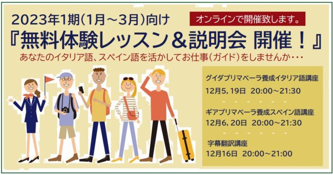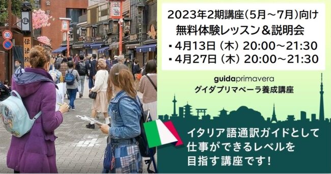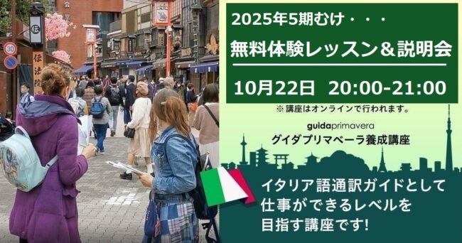 9月15日開講の「グイダプリマベーラ養成オンラインスペイン語講座」の無料体験レッスン&説明会を開催致します! 前回に引き続き、オンラインでの開催となります! 訪日ガイド・アシスタントのお仕事に必要な知識・技術をスペイン語で学んでいきましょう!